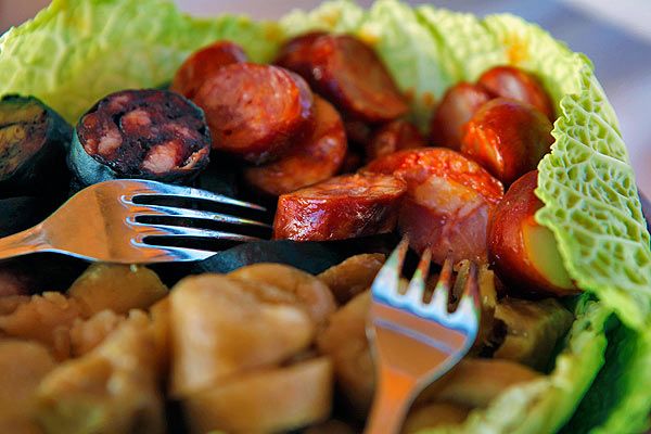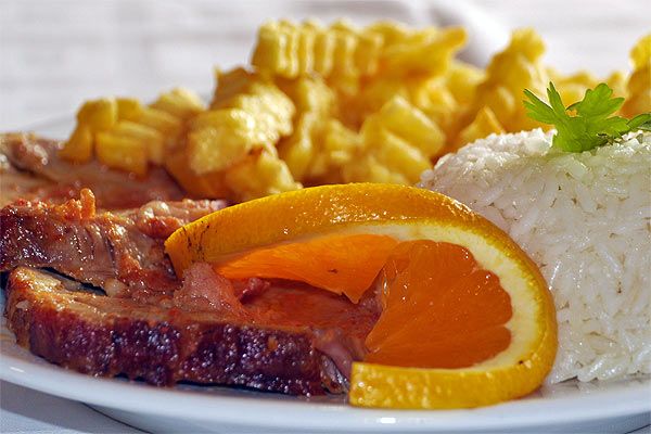 Pão e azeitonas pequenas e deliciosas, presunto, salpicão, petingas fritas. Bacalhau à Solar, Bucho e Maranho pratos de gastronomia regional sempre presentes. Mas há muito, muito mais.